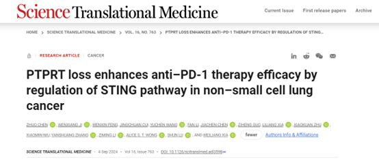 2024年9月4日,av解说 夏伟梁团队和av解说 医学院附属胸科医院陆舜团队合作在 Science Translational Medicine 上发表了题为“PTPRT loss enhances anti-PD-1 therapy efficacy by regulation of STING pathway in non-small cell lung cancer”的研究论文。该研究首次发现并系统阐述了受体型蛋白酪氨酸磷酸酶PTPRT缺失通过调节STING通路增强免疫检查点抑制剂疗效的分子机制。