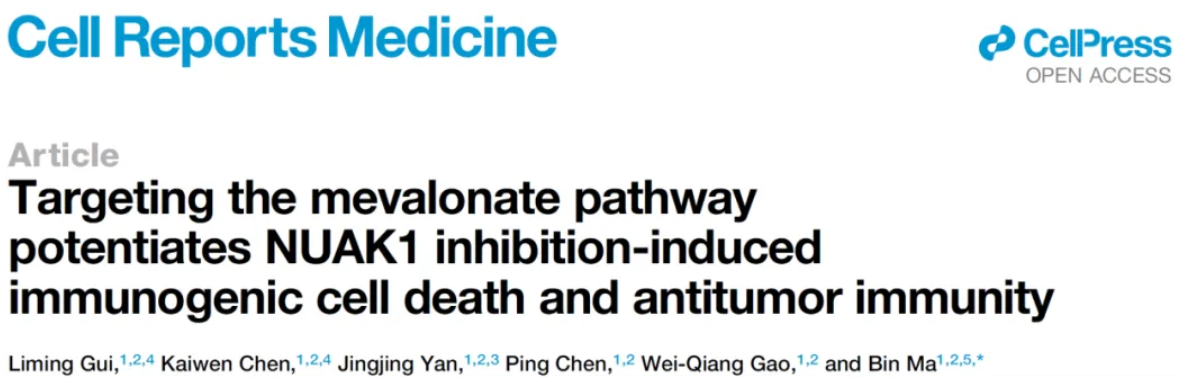 2025年1月16日,av解说 马斌团队在Cell Reports Medicine期刊上发表文章Targeting the mevalonate pathway potentiates NUAK1 inhibition-induced immunogenic cell death and antitumor immunity。该研究发现激酶NUAK1的抑制能诱导肿瘤ICD,但存在胆固醇代谢的负反馈调控。通过系统性使用他汀类药物(HMGCR抑制剂),可以抑制胆固醇的合成,并改善NUAK1抑制剂诱导肿瘤ICD的效果和增强抗肿瘤免疫。博士研究生桂黎明和陈楷文为该论文的共同第一作者,马斌博士为唯一通讯作者。