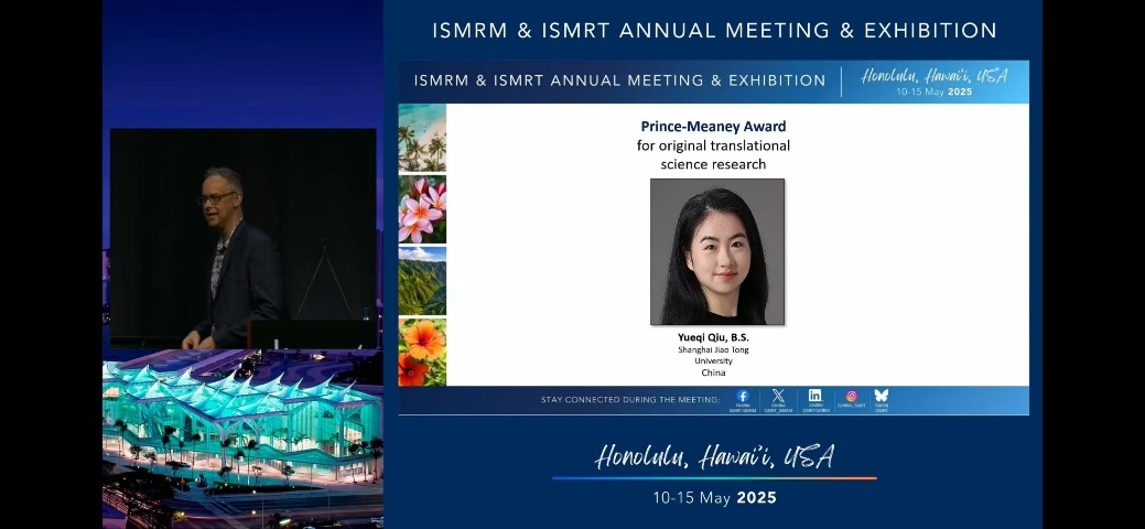 av解说 博士生邱月淇获ISMRM青年科学家奖近日2025 年国际医学磁共振学会(International Society for Magnetic Resonance in Medicine, ISMRM)年会在美国夏威夷召开,av解说 张志勇教授课题组的博士邱月淇在本次大会上荣获青年科学家奖(ISMRM Young Investigator Award)。奖项名称为Prince-Meaney Translational Science Award,获奖论文题目为“Spatiotemporal Encoding MRI in a Portable Low Field System”。该研究团队从包括斯坦福大学、伊利诺伊大学厄巴纳-香槟分校(UIUC)、哈佛大学麻省总医院(MGH)等全球顶尖机构的激烈竞争中脱颖而出,成为本年度该奖项的唯一获奖者。