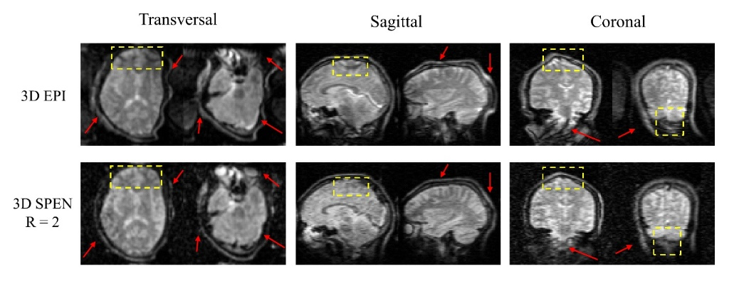 本研究创新性地开发了适用于无多通道并行加速便携设备的时空编码(Spatio-temporal encoding, SPEN)采集方法。与传统平面回波成像(Echo planar imaging, EPI)技术相比,欠采样的SPEN图像都展示了良好的抗畸变能力和较少的伪影,图像质量较高。使用SPEN对健康志愿者进行了脑部2D DWI扫描,以及在约3分钟内对全脑进行分辨率为2.5mm的3D SPEN实验。结果表明,在缺乏多通道线圈支持的便携式磁共振系统中,SPEN序列也可以较好地减少场不均匀性导致的图像畸变,为便携式磁共振系统开展快速脑组织扩散特性分析提供了新方法,有望进一步拓宽便携式低场磁共振的临床应用价值。