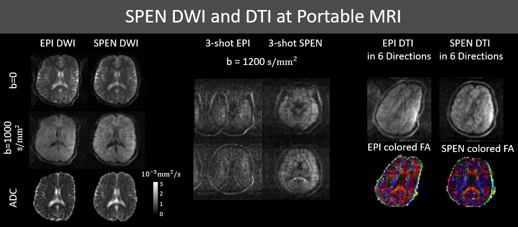 研究团队在评奖报告中进一步展示了SPEN技术的系列创新拓展,包括SPEN DTI, SPEN RF-encoded及交叉时空编码成像xSPEN等技术在便携式磁共振设备上的转化应用。这些突破不仅推动了低场磁共振技术的发展,更为便携式MRI设备的临床转化应用提供了关键技术支撑。
