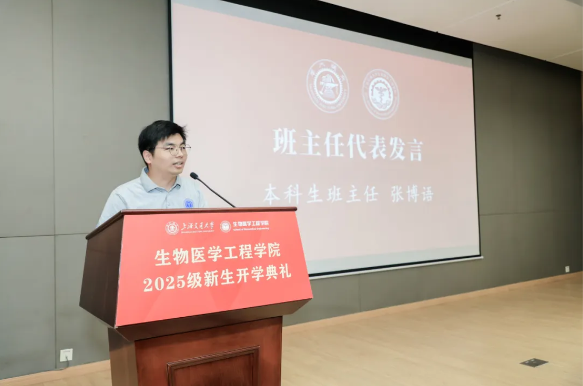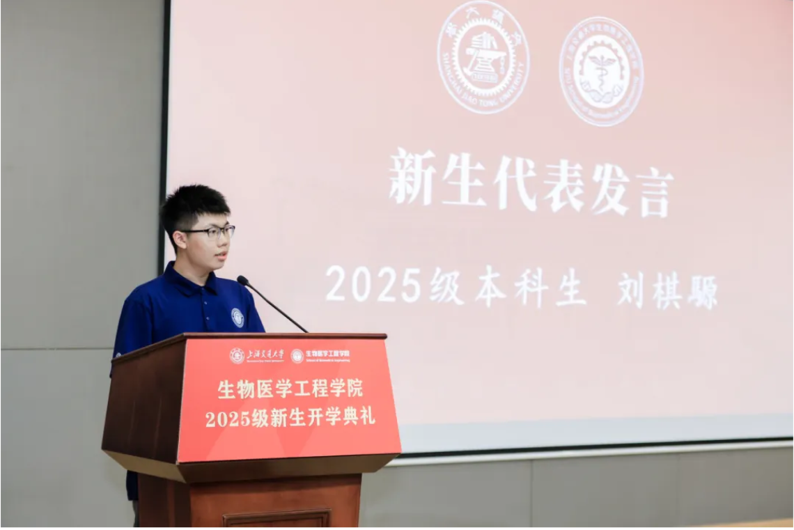 随后,刘棋騵同学作为本科生代表发言。作为刚刚结束军训的大一新生,他分享了在军训期间的收获和感悟,尤其是集体收看“九·三”阅兵时领略到钱学森、黄旭华等一代代交大人的卓越贡献。他结合自己与交大的情缘和选择生医工专业的初衷,积极畅想新时代医工青年的广阔前景和使命担当。