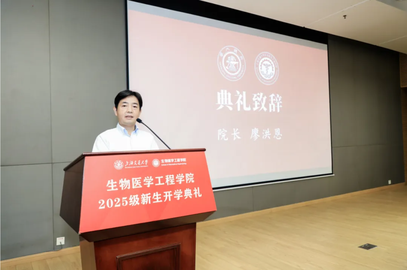 廖洪恩为本次开学典礼致辞。他从人工智能为代表的新一轮科技革命带给人类社会生产和生活方式谈起,与新生一起探讨生医工交叉学科前所未有的机遇和挑战,介绍了学院的学科布局和“科研-教学-育人”一体化的创新生态建设。同时,他作为在医工领域深耕近三十年、成绩卓著的学者寄语新生并提出了殷切的希望:要保持好奇心和求知欲,积极探索未知领域,勇往直前;培养跨学科思维,提升综合素养,创新实践;要心怀家国、拥抱世界,勇担时代的责任与使命。