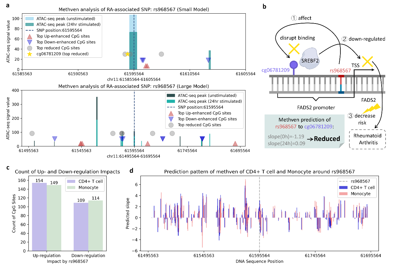 故事的“另一半”来自 Methven。今年1月,团队在Advanced Science 发表了Methven工具:它回答的是“非编码突变如何改变 DNA 甲基化”,而且是单细胞分辨率。Methven同样整合 DNA 序列与单细胞 ATAC-seq,以 DNABert2 预训练表征 + BiGRU 为核心,在 ±100 kb 区间内建模 SNP-CpG 作用,既做方向判别也做强度回归。系统比较显示,它在长短距离两档均优于既有方法(如 CpGenie、Enformer),对单核细胞等外部数据也有不错的外推;在 RA 应用里,Methven 能定位到与病程相关的 CpG 与通路,提供表观层的因果线索。