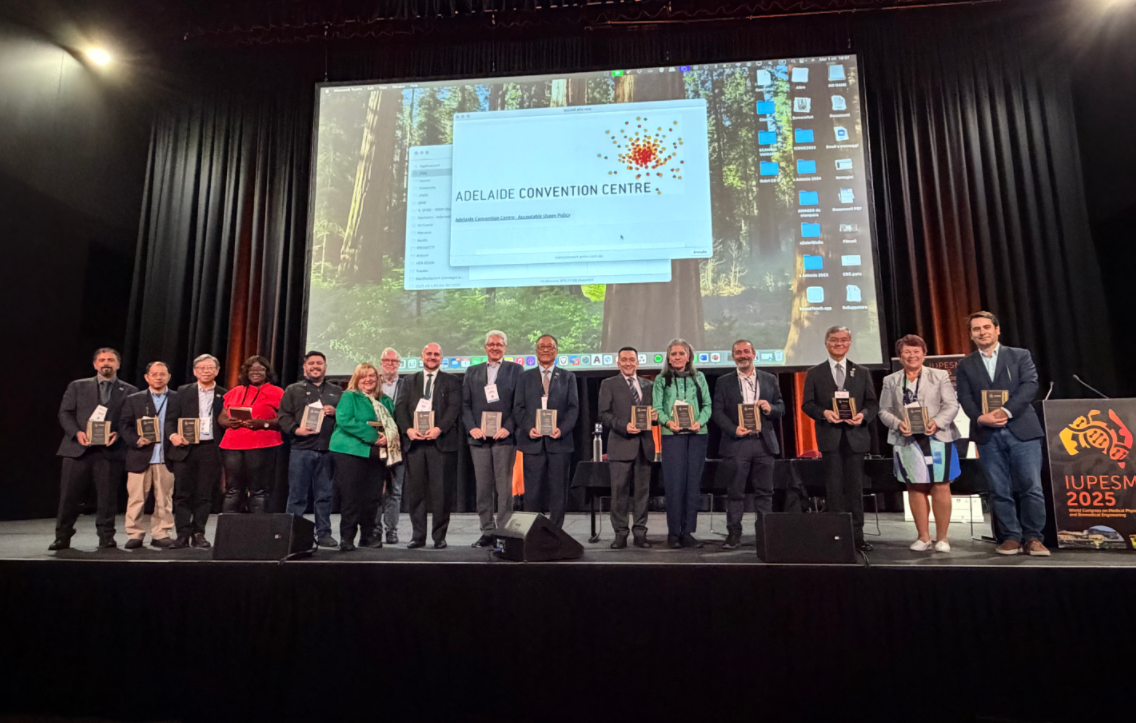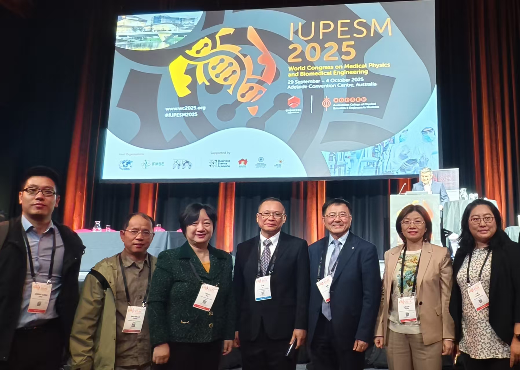 2025年9月29日至10月4日,每三年一届的2025世界医学物理和生物医学工程大会(IUPESM 2025)在澳大利亚阿德莱德市会议中心盛大举行。来自全球80多个国家一千多名医学物理与生物医学工程领域的专家学者、学生、以及产业界代表齐聚一堂,共话行业前沿动态与未来发展方向。av解说 致远学院院长、磁共振诊疗高端技术国家工程研究中心主任、中国生物医学工程学会常务理事、av解说 讲席教授徐学敏,av解说 主动健康战略与发展研究院副院长、av解说 附属第六人民医院临港院区原副院长、中国生物医学工程学会理事李斌,av解说 教师童善保、隋晓红、娄越及多位研究生一行组成的代表团,凭借多项奖项以及在国际医学与生物学联合会(IFMBE)中的突出贡献,彰显了上海交大在医学工程领域卓越的人才培养能力以及学科的国际影响力。