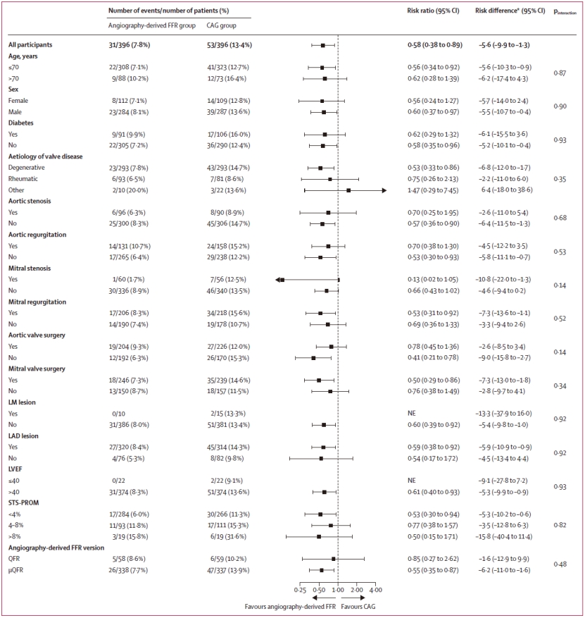 术后30天内,造影指导组不良事件发生率为13.4%,而QFR指导组发生率为7.8%,事件风险相对降低42%(RR 0.58 [95% CI 0.38 - 0.89];P = 0.011;表1)。这一改善主要源于心肌梗死发生率的显著下降:造影指导组22例(5.6%),QFR指导组仅6例(1.5%),风险降低73%。预设亚组分析未发现治疗效应的异质性(图1)。